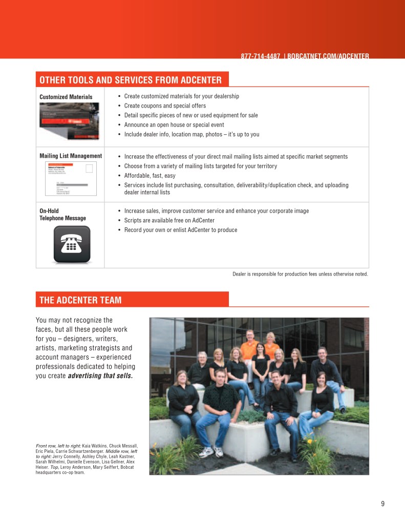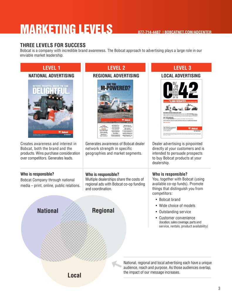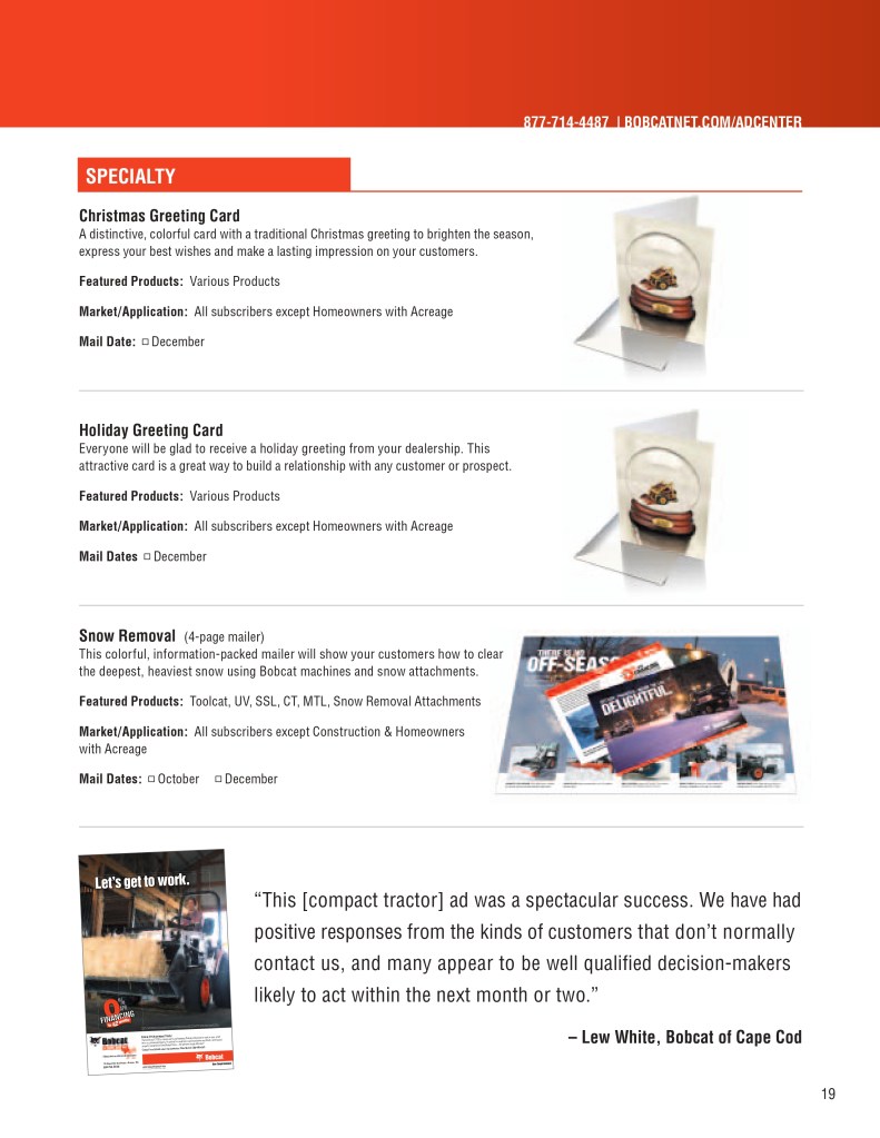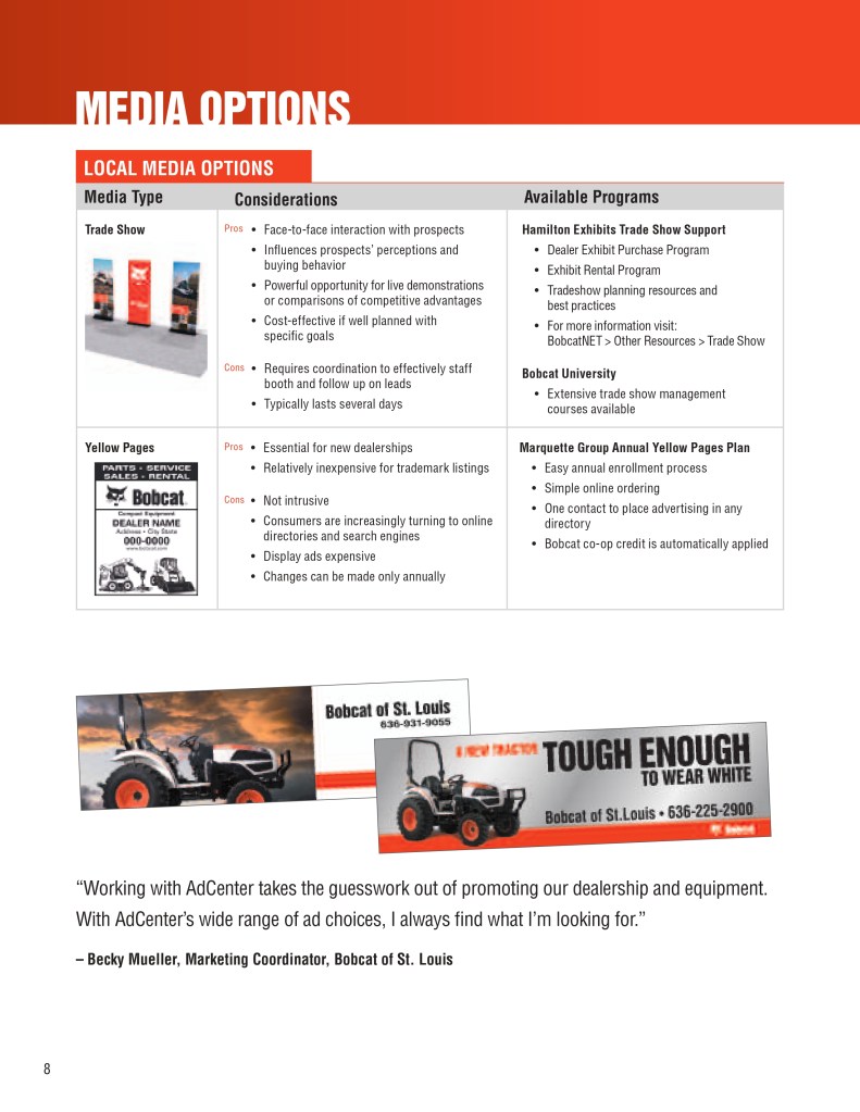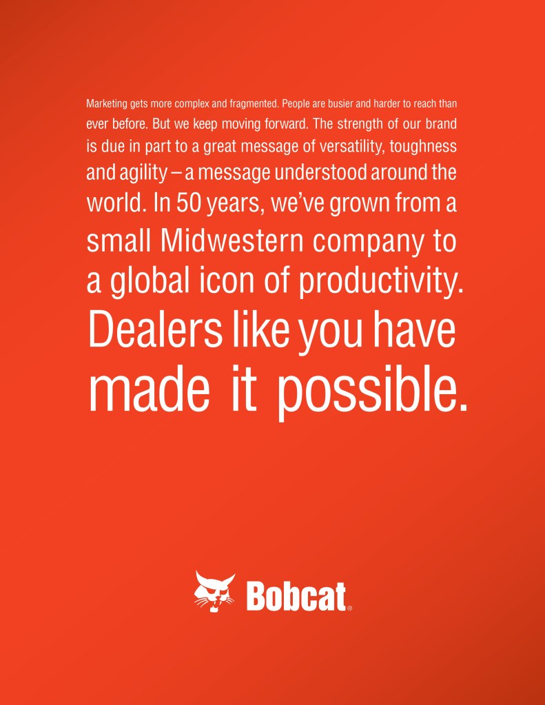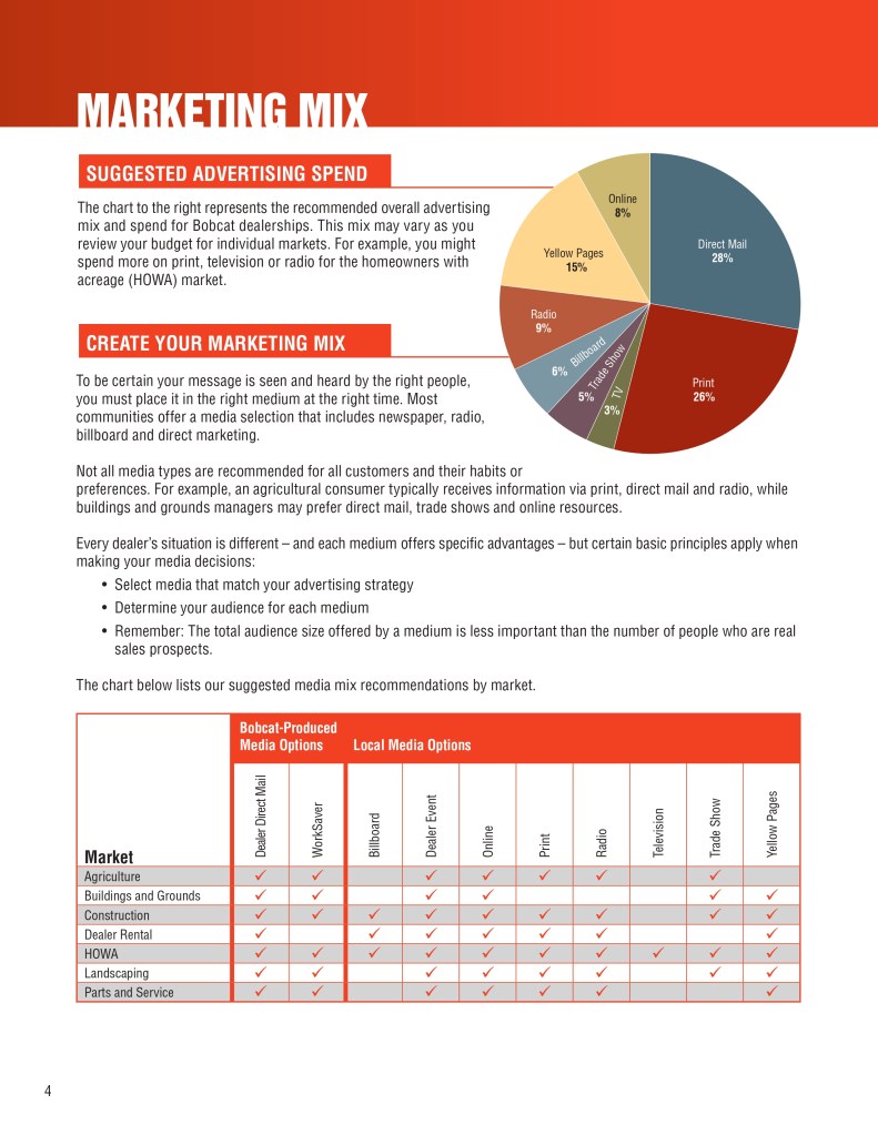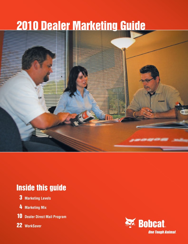 Below is a sample of the Bobcat Dealer Marketing Guide created to engage and support Bobcat dealers with their marketing efforts. As the GM for Flint Direct (Division of Flint Communications) I was responsible for the strategic direction of how this department would support Bobcat, Bobcat dealers and Flint Communications. Over the course of a few years I managed a team of 3 to a dedicated team of 13 whose focus was dedicated to dealer channel marketing for clients with multiple store/dealer locations. This work included: direct mail, email marketing, website build, list management, ad builder program, strategy planning, and custom creative – all guaranteed to be brand compliant.