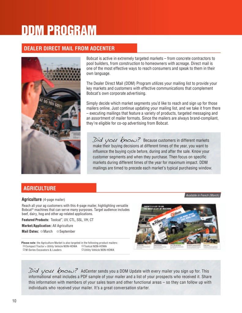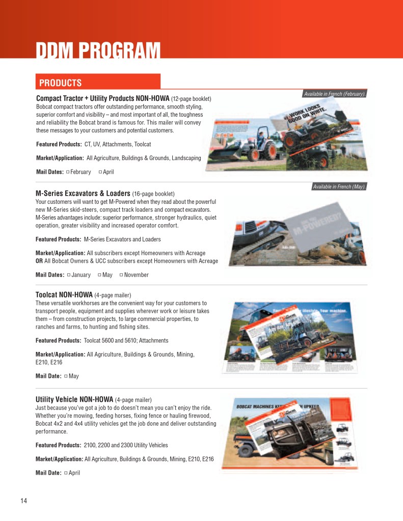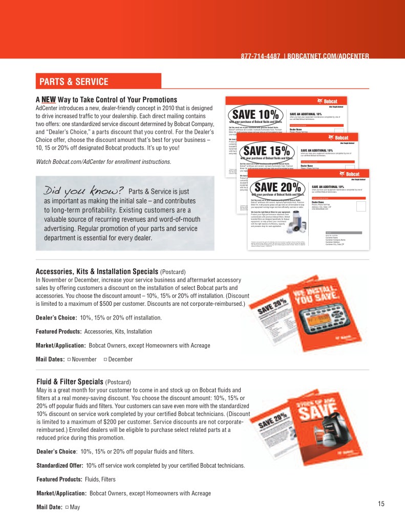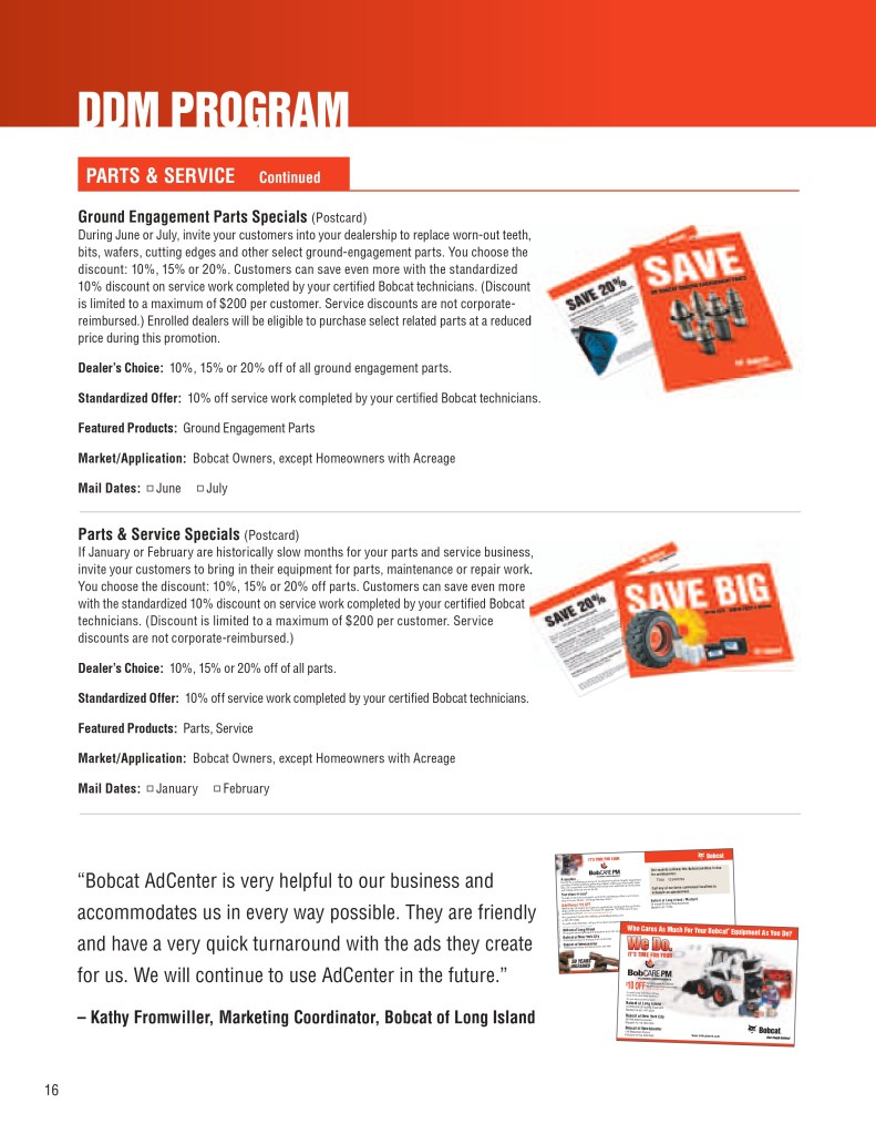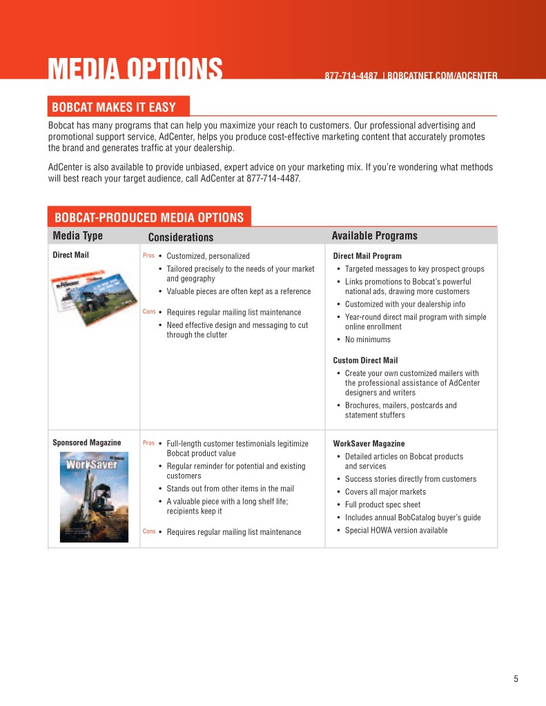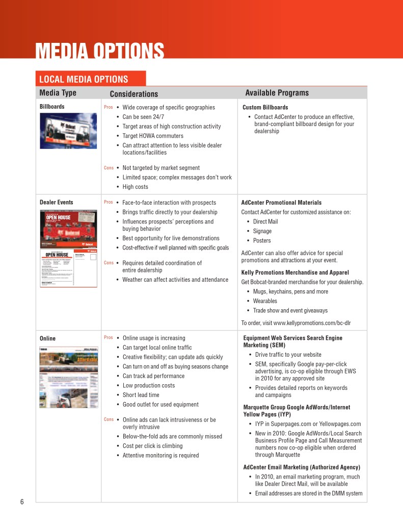 Below is a sample of the Bobcat Dealer Marketing Guide created to engage and support Bobcat dealers with their marketing efforts. As the GM for Flint Direct (Division of Flint Communications) I was responsible for the strategic direction of how this department would support Bobcat, Bobcat dealers and Flint Communications. Over the course of a few years I managed a team of 3 to a dedicated team of 13 whose focus was dedicated to dealer channel marketing for clients with multiple store/dealer locations. This work included: direct mail, email marketing, website build, list management, ad builder program, strategy planning, and custom creative – all guaranteed to be brand compliant.