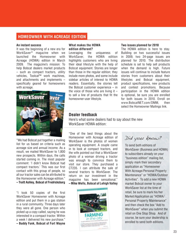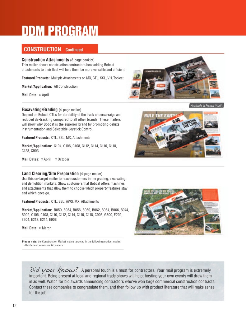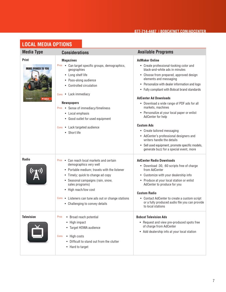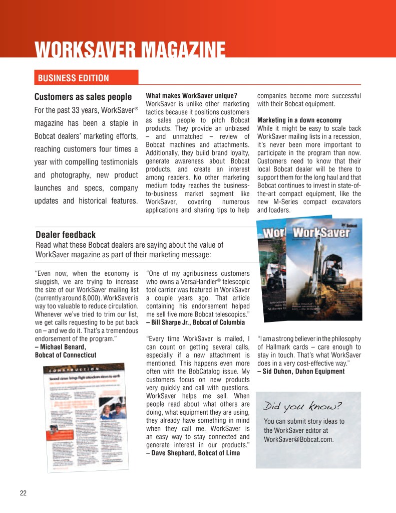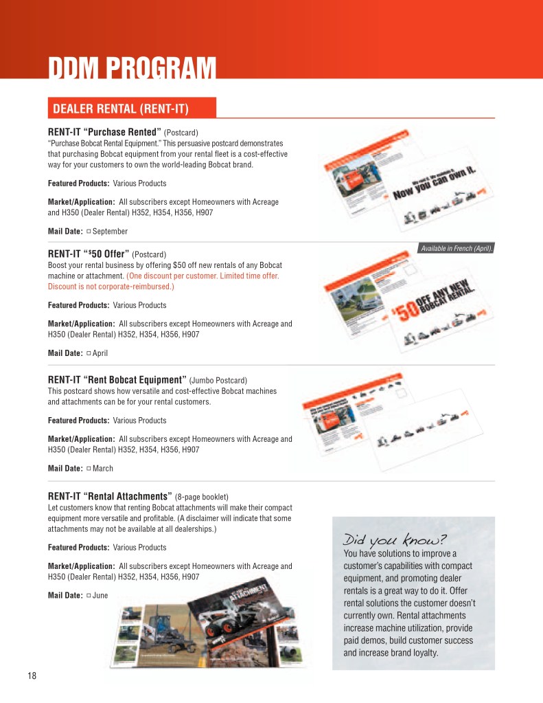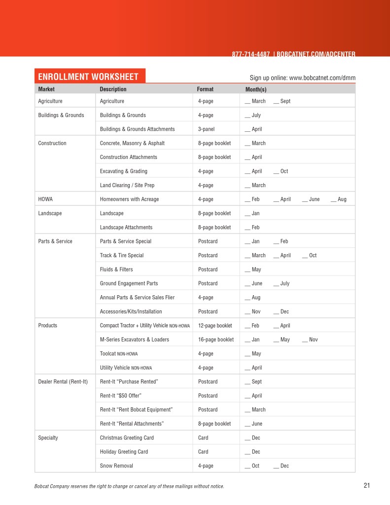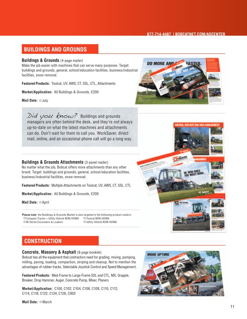 Below is a sample of the Bobcat Dealer Marketing Guide created to engage and support Bobcat dealers with their marketing efforts. As the GM for Flint Direct (Division of Flint Communications) I was responsible for the strategic direction of how this department would support Bobcat, Bobcat dealers and Flint Communications. Over the course of a few years I managed a team of 3 to a dedicated team of 13 whose focus was dedicated to dealer channel marketing for clients with multiple store/dealer locations. This work included: direct mail, email marketing, website build, list management, ad builder program, strategy planning, and custom creative – all guaranteed to be brand compliant.